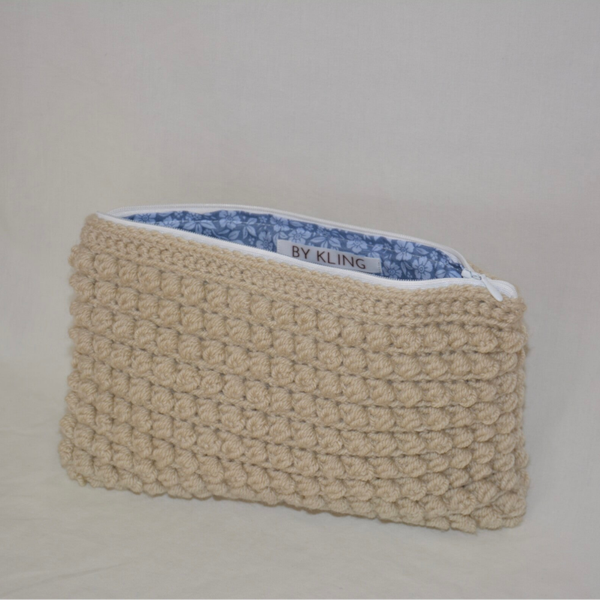Denna necessär passar lika bra i väskan som på badrumshyllan – ett praktiskt val för dig som uppskattar en avskalad design med en personlig touch. Necessären är virkad för hand i 100% akrylgarn och fodrad med bomullstyg. Stängs med dragkedja.