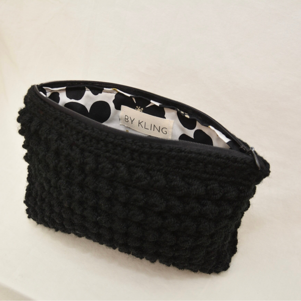 Denna necessär passar lika bra i väskan som på badrumshyllan – ett praktiskt val för dig som uppskattar en avskalad design med en personlig touch. Necessären är virkad för hand i 100% akrylgarn och fodrad med bomullstyg. Stängs med dragkedja.