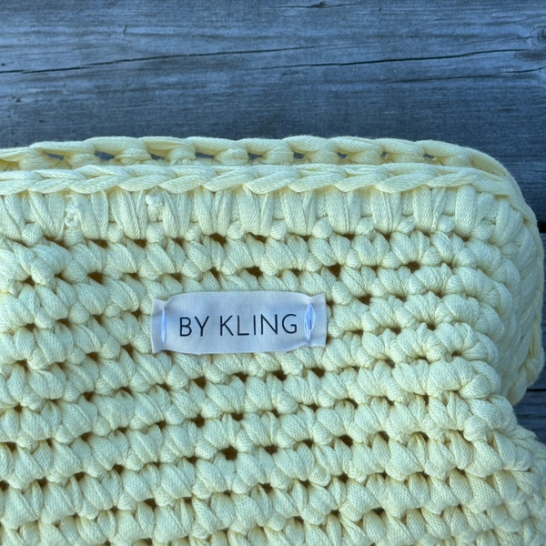 Stilren och somrig clutch, virkad för hand i 100% bomull. Den har en stadig metallbåge som gör den enkel att öppna och stänga. Perfekt som necessär eller liten väska till vardag och fest.